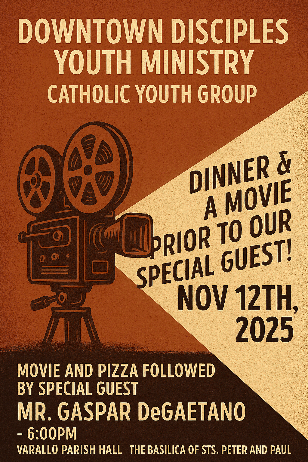 ***DETAILS*** When: Wed. Nov 12th @ 6:00- 8:00 PM What: Pizza, Snacks, Movie️, Guest Speaker Who: Mr. Gaspar DeGaetano (retired Deacon and former Diocesan Postulator for the Cause of Father Patrick Ryan)⛪ Who Should Come: ALL MIDDLE AND HIGH SCHOOL YOUTH